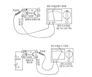 這里以MF50型指針式萬用表和4腳PC817型光電耦合器為例,說明具體檢測方法:首先,按照圖1(a)所示,將指針式萬用表置于“R×100”(或“R×1k”)電阻擋,紅、黑表筆分別接光電耦合器輸入端發(fā)光二極管的兩個引腳。如果有一次表針指數(shù)為無窮大,但紅、黑表筆互換后有幾千至十幾千歐姆的電阻值,則此時黑表筆所接的引腳即為發(fā)光二極管的正極,紅表筆所接的引腳為發(fā)光二極管的負極。